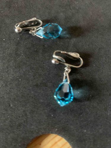 This is a pair of vintage clip-on dangle earrings featuring faceted aqua-blue crystal teardrops suspended from silver-tone metal bails. Each earring consists of a mechanical clip-on fastener with a small decorative ball at the hinge, which provides a classic mid-20th-century aesthetic. The crystals are briolette-cut or teardrop-shaped with geometric facets that enhance internal light refraction, suggestive of glass or costume crystal rather than high-end gemstones. The metal hardware appears to be a rhodium-plated or high-polish silver-tone base metal, typical of mid-century costume jewelry produced between the 1950s and 1970s. The construction utilizes a jump ring connection between the clip and the bail, allowing for movement when worn. Visible condition issues include slight oxidation or tarnish on the inner surfaces of the clips and microscopic abrasions on the crystal facets consistent with age and light wear. No designer marks are immediately visible, indicating these may be high-quality mass-produced boutique pieces from that era. The blue hue of the crystal is vibrant, often nicknamed 'aquamarine' in the context of period costume jewelry.