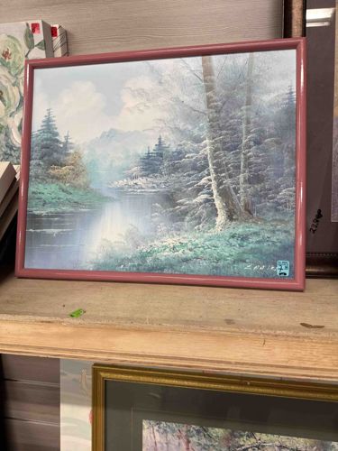 This item is a landscape art print depicting a tranquil, misty forest scene with a lake and mountains in the background. The artwork features a palette of cool tones including soft blues, whites, and muted greens, evoking a morning frost or foggy atmosphere. The composition emphasizes tall, snow-dusted conifer trees on the right bank that lean slightly over a reflective water source. The piece is housed in a modern, slim-profile frame finished in a dusty rose or mauve pink color, likely made of wood or composite material. Measuring approximately 16x20 inches, the print displays a signature in the bottom right corner (likely 'LEWIS' or similar), though it appears to be a mass-produced decorative print rather than an original painting. A light blue price or inventory sticker is affixed directly to the glass or print surface in the lower right corner. The condition appears fair, with no visible tears or severe fading, though the frame shows some minor surface wear consistent with thrift-store handling. The style is reminiscent of mid-to-late 20th-century commercial interior decor, specifically the popular 'wet-on-wet' landscape trend of the 1980s.