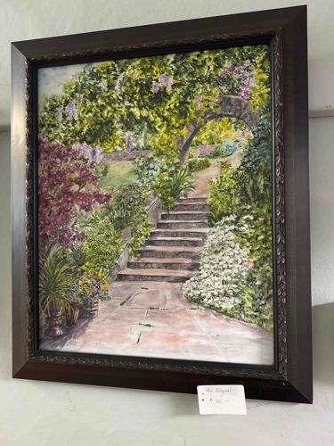 This is a contemporary original painting, likely executed in acrylic or oil on canvas or panel, depicting a lush garden scene. The composition features a stone path leading up a set of stairs toward a stone archway, framed by an abundance of floral elements including purple wisteria, white shrubbery, and various greenery. The style is Impressionist, utilizing dabbed, textured brushstrokes to convey light and movement through the foliage. The color palette is vibrant, dominated by verdant greens, lavender, and earth tones in the stonework. The artwork is housed in a substantial dark brown beveled frame with an inner ornamental leaf-motif border. A small white tag at the bottom indicates it is 'An Original.' While no prominent artist signature is visible in the lower corners, the craftsmanship suggests a skilled hand with attention to light and shadows. The condition appears excellent with no visible tears, craquelure, or fading, though the frame shows very minor signs of handling. The piece reflects a late 20th to early 21st-century aesthetic, focusing on serene, classical garden imagery with high-quality framing materials.