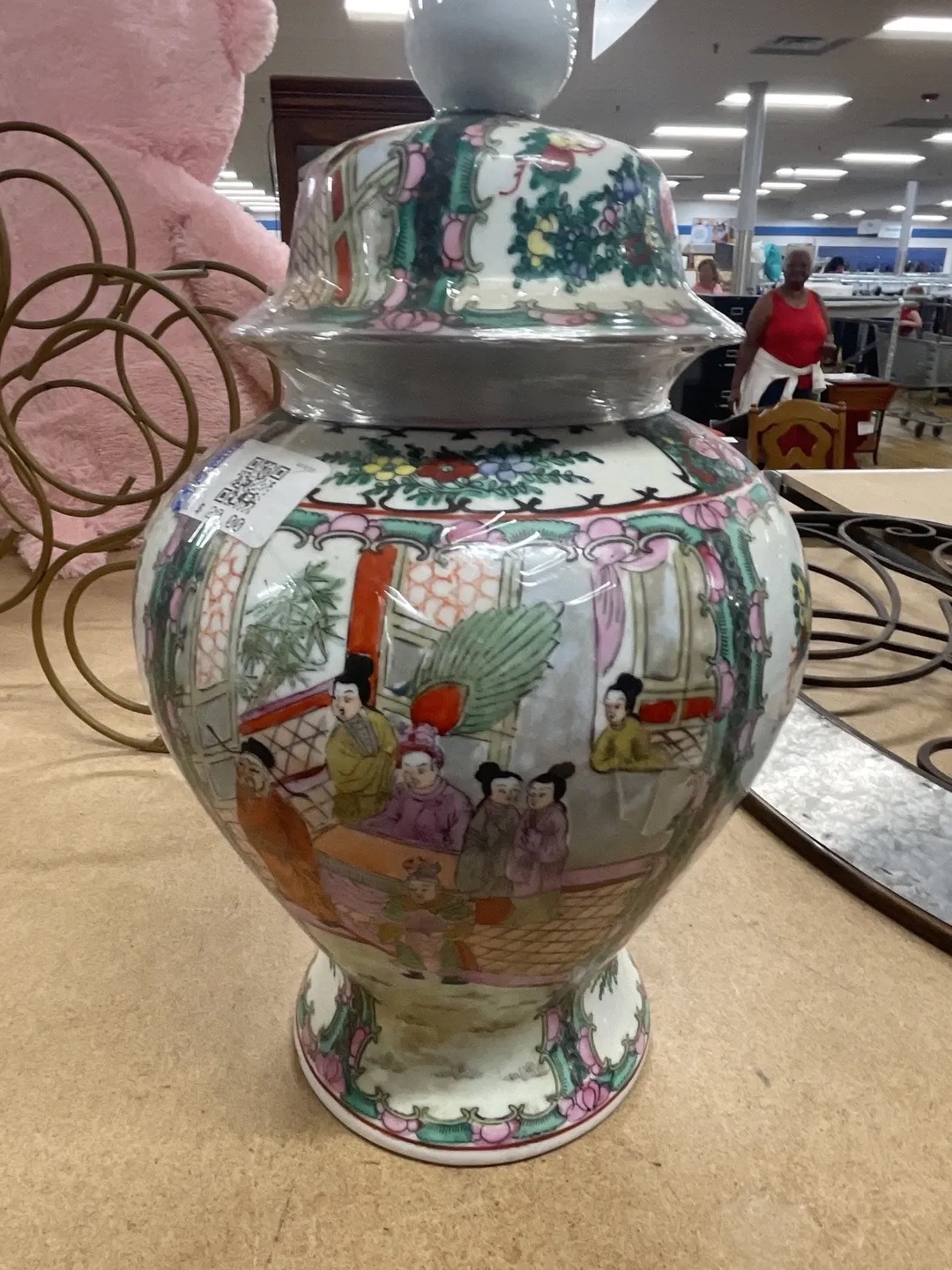 A decorative porcelain ginger jar featuring the traditional Rose Medallion pattern, popular in the 19th and 20th centuries. The jar is of a classic baluster shape with a matching domed lid topped with an orb-shaped finial. The exterior is ornately decorated with hand-painted polychrome enamels, alternating between rectangular panels of courtly figural scenes and floral/botanical motifs. The figural scenes depict multiple individuals in traditional Chinese attire within an interior architectural setting. The color palette is dominated by 'famille rose' pinks, greens, reds, and yellows, accented with black outlines and gold leaf highlights. The craftsmanship suggests a 20th-century production, likely mid-to-late century, given the vibrancy of the enamels and the execution of the transfer-print outlines which are often hand-colored in later iterations. The piece appears to be in good vintage condition, though it is currently protected with plastic wrap around the lid/rim area, possibly to secure the lid during transport or sale in a retail environment. No significant cracks or chips are visible from this angle, though minor surface wear to the gilt and enamel is expected for an item of this age. A price tag with a QR code is affixed to the upper shoulder of the vessel.