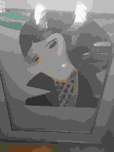 This item is an original painting, or a high-quality reproduction of a painting, depicting a stylized female figure in a mid-century modern or Cubist-adjacent aesthetic. The composition features a woman with an elongated face tilted at an angle, characteristic of early 20th-century avant-garde influences. She is depicted wearing a dark, possibly black, wide-lapelled jacket over a patterned blouse or scarf featuring a geometric, diamond-like motif in ochre and black. Her features are simplified: almond-shaped eyes, a slender nose, and small lips, with a singular pearl or circular earring providing a focal point of light. The color palette is dominantly muted, utilizing earthy tones, greys, and blacks, which suggests an influence from the School of Paris or artists like Modigliani and Matisse. The work is housed in a substantial, possibly wooden, frame with a visible inner border that appears to be finished in a neutral or metallic tone. There are significant reflections across the surface of the image, suggesting the work is protected by glass. This protective glazing makes it difficult to ascertain the exact medium, though it appears to be oil or gouache based on the flat application of color and lack of canvas texture. No signatures or date marks are clearly visible from this angle, but the style suggests a creation period between 1940 and 1960. The condition appears stable within the frame, though the glare on the glass obscures minor details of potential surface patina or craquelure.