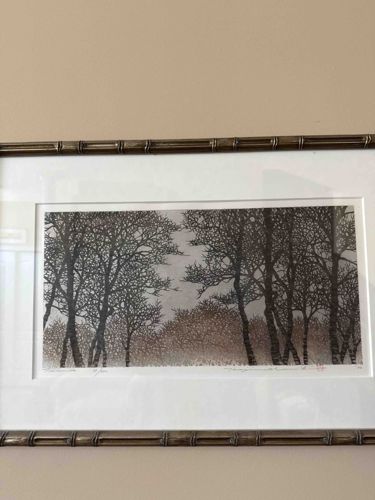 This is a horizontal orientation limited edition woodblock print, likely a Japanese 'shin-hanga' or contemporary woodcut, depicting a dense silhouette of trees. The piece is characterized by intricate line work representing bare winter branches set against a soft, misty background that transitions from a pale grey sky to a warm, brownish-sepia tone at the base. The paper appears to be an off-white or cream-colored wove paper typical of fine art printmaking. Below the image, there are visible hand-written inscriptions in pencil: the limited edition numbering '15/200' is located on the left, a titles or artist signature is in the center, and a red artist's seal (hanko) is present on the right, which is a hallmark of authentic Japanese printmaking. The print is professionally matted with a wide white border and housed in a vintage-style decorative frame with a faux-bamboo texture in a dark bronze or metallic finish. The condition appears excellent with no visible foxing, water damage, or fading, though the frame shows some minor dust accumulation. The craftsmanship is high-quality, showing precise registration and delicate ink layering that creates a sense of deep atmosphere and perspective. The style suggests a late 20th-century creation, possibly following in the tradition of artists like Reika Iwami or Hajime Namiki.