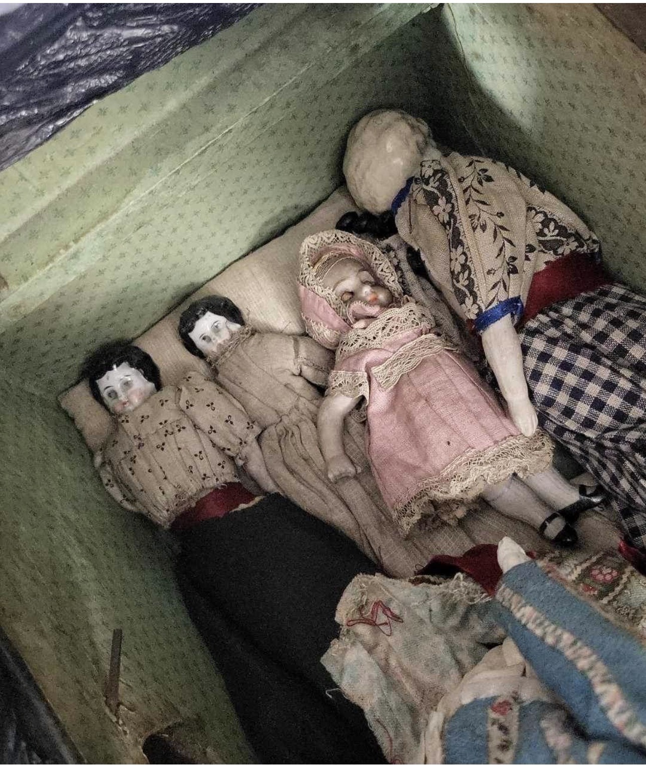 This assembly consists of several miniature dolls housed within a vintage trunk. The collection includes at least two china head dolls featuring glazed porcelain heads with painted black hair, molded in popular mid-to-late 19th-century styles like the 'flat top' or 'low brow' look. Additionally, there is a miniature bisque doll wearing an intricate pink lace-trimmed dress and a matching bonnet. The dolls feature high-quality craftsmanship characteristic of German manufacturing from the 1860s to the 1890s. Their bodies appear to be made of cloth or kid leather, with some having porcelain lower limbs, as evidenced by the doll in the pink dress sporting molded and painted black slippers. The textiles used for their clothing include calico prints, floral-patterned linens, and gingham checks, all indicative of Victorian-era doll costuming. Condition issues are notable, including significant surface soot and dust accumulation, foxing on the fabrics, and potential hairline fractures or paint loss on the porcelain components. The trunk interior is lined with a deteriorating green patterned wallpaper, suggesting these have been stored for many decades. The overall patina reflects authentic age, though professional cleaning and stabilization would be required for conservation purposes.