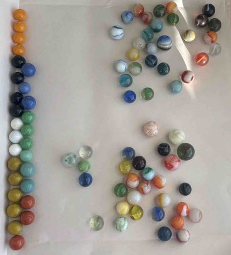 This collection consists of approximately 75 machine-made glass marbles of various styles, sizes, and colors. The group includes a variety of classic types such as cat's eyes, solid game marbles, patches, and swirls. The sizes appear to be standard player sizes, likely ranging from 1/2 inch to 5/8 inch in diameter. The color palette is extensive, featuring solid opaque marbles in orange, black, white, and green, along with translucent glass containing internal ribbons of color typical of the cat's eye style. Construction is primarily soda-lime glass, with some showing the internal 'v' or 'banana' ribbons characteristic of mid-20th-century mass production. Notable patterns include swirled multi-color marbles that resemble Vitro Agate or Akro Agate styles from the late 1940s to the 1960s. The condition across the group is varied; several marbles show surface dullness, minor flea bites, and small impact fractures consistent with play-wear. Some of the solid-colored marbles appear to have a faceted glass texture, possibly indicating they are game pieces. No visible maker's marks are present, which is standard for marbles of this type and era. The craftsmanship is typical of high-volume industrial glass production, with varied quality in the internal color distribution and spherical symmetry.