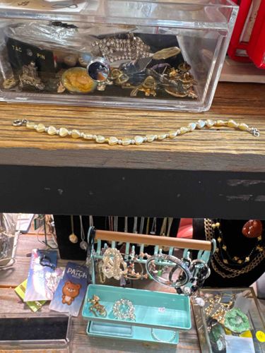 This item is a costume jewelry bracelet featuring a repeating pattern of cream-colored, heart-shaped beads interspersed with small spherical iridescent accent beads. The construction appears to be stringed or wired, terminating with a simple metallic spring ring or lobster-style clasp and a jump ring at the opposite end. Based on the visual luster and uniform shape, the beads are likely synthetic faux pearls or molded resin designed to mimic organic material. The metallic components show signs of a silver-tone finish that appears somewhat dull, suggesting a base metal alloy typical of mid-to-late 20th-century mass-market jewelry. The condition is fair to good; there is no immediate evidence of major breakage, though some minor surface abrasions or loss of the pearlescent coating may be present upon closer inspection. The style is kitsch and feminine, likely originating from the 1980s or 1990s as a budget-friendly fashion accessory. The absence of visible hallmark tags or designer signatures on the clasp area suggests it is an unbranded mass-produced piece.