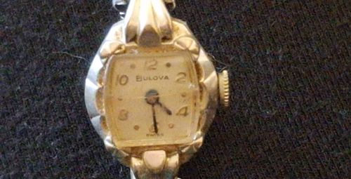 This is a vintage Bulova ladies' dress or cocktail watch, likely dating from the 1950s or 1960s based on its stylistic elements. The watch features a small, dainty rectangular-to-cushion shaped ivory dial housed within a highly decorative white gold-toned metal case. The case boasts a scalloped or 'fancy' bezel with architectural lug details that suggest an Art Deco influence transitioning into Mid-Century design. The dial displays the 'BULOVA' name prominently at the 12 o'clock position, with 'SWISS' visible at the bottom, indicating a Swiss-made movement. It utilizes a mix of Arabic numerals (12, 2, 4, 8, 10) and dot markers, all in a gold-tone finish to match the hands. The case shows visible signs of age including surface scratches, some tarnishing, and potential wear to the plating on the high points of the decorative bezel. The crystal appears slightly clouded or scratched from use. There is a textured winding crown on the right side. The overall craftsmanship reflects the high-quality standards of Bulova during this era, focusing on jewelry-like aesthetics for women's formal timepieces. The watch is attached to a flexible expansion-style metal bracelet, which was common for this period but may be a later replacement.