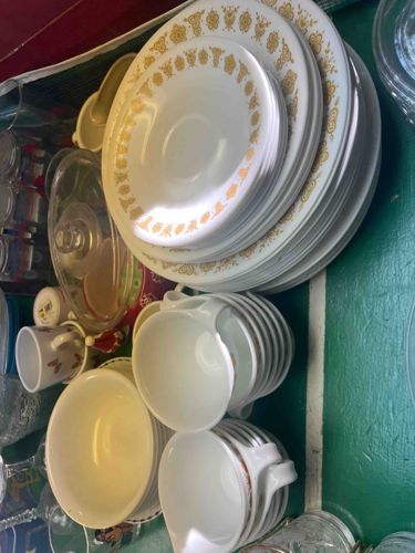 This is a vintage collection of Corning Corelle dinnerware featuring the iconic 'Butterfly Gold' pattern, which was produced primarily between 1970 and 1981. This set is constructed from Vitrelle, a tempered glass laminate consisting of three layers of thermally bonded glass, known for its light weight and extreme durability. The pattern features a distinctive mustard-yellow or harvest-gold floral and butterfly motif circling the rims of the white opaque plates. The assortment shown includes several nested dinner plates, salad plates, and a stack of matching small bowls. The cups in the foreground appear to be the 'hook-handled' variety, often made of milk glass (pyrex) rather than Vitrelle, which was common for the early sets. In terms of condition, these items generally show well for their age, but a slight fading of the gold-toned pattern is visible on some rims, common with repeat dishwasher use. One cup shows visible build-up or staining along the rim. There are no obvious chips or 'flea bites' visible in the stack, though close inspection of the underside stamps (Corning, NY, USA) would be required to confirm the specific production run. The craftsmanship is utilitarian yet nostalgic, representing a quintessential mid-century modern aesthetic found in American households during the 1970s.