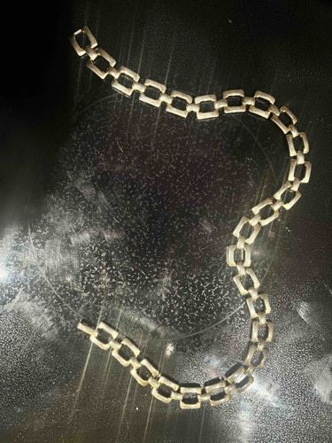 This item is a necklace featuring a series of uniform, open rectangular links connected by smaller vertical bars. The piece appears to be made of a silver-toned metal, likely pewter or a plated base metal, exhibiting a matte finish with a distinct aged patina. Each rectangular link has a slightly rounded corner profile and a textured surface that suggests a mid-century modernist influence, typical of 1960s or 1970s costume jewelry. The construction utilizes mechanical hinge-like connections between the geometric sections, allowing for flexibility and movement when worn. The necklace approximately measures 16 to 18 inches in length. Condition-wise, the metal shows significant surface grime and localized oxidation, particularly within the recessed areas of the links. There is evidence of minor surface scratching and some wear to the finish throughout. While no specific maker's marks are visible in the current view, the industrial yet elegant aesthetic is characteristic of mass-produced vintage accessories from that era. The overall craftsmanship is sturdy, with thick guage metal used for the links, indicating a mid-range quality for the period.