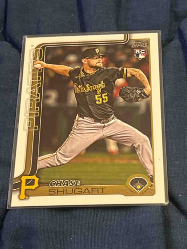 This is a standard-sized (2.5" x 3.5") modern baseball trading card featuring pitcher Chase Shugart of the Pittsburgh Pirates. Produced by Topps for their 2024 Series 1 collection, the card features a high-gloss finish on cardstock with a white-bordered design. The front image showcases an action shot of Shugart in a full pitching motion, wearing the Pirates' black away jersey with gold lettering and number 55. Notable markings include the 'Topps' logo and the official MLB 'RC' (Rookie Card) shield in the upper right corner. The left side features a vertical 'PIRATES' wordmark inside a stylized neon-like border. The player's name is printed at the bottom in a gold-toned banner next to the team's 'P' logo. The card appears to be in Excellent to Near-Mint condition, housed within a protective clear plastic sleeve. The centering appears slightly heavy toward the right border. There are no visible surface scratches, corner softening, or edge chipping in the provided image. This item represents a modern sports collectible from the current era of professional baseball card manufacturing, characterized by high-definition photography and digital graphic elements.