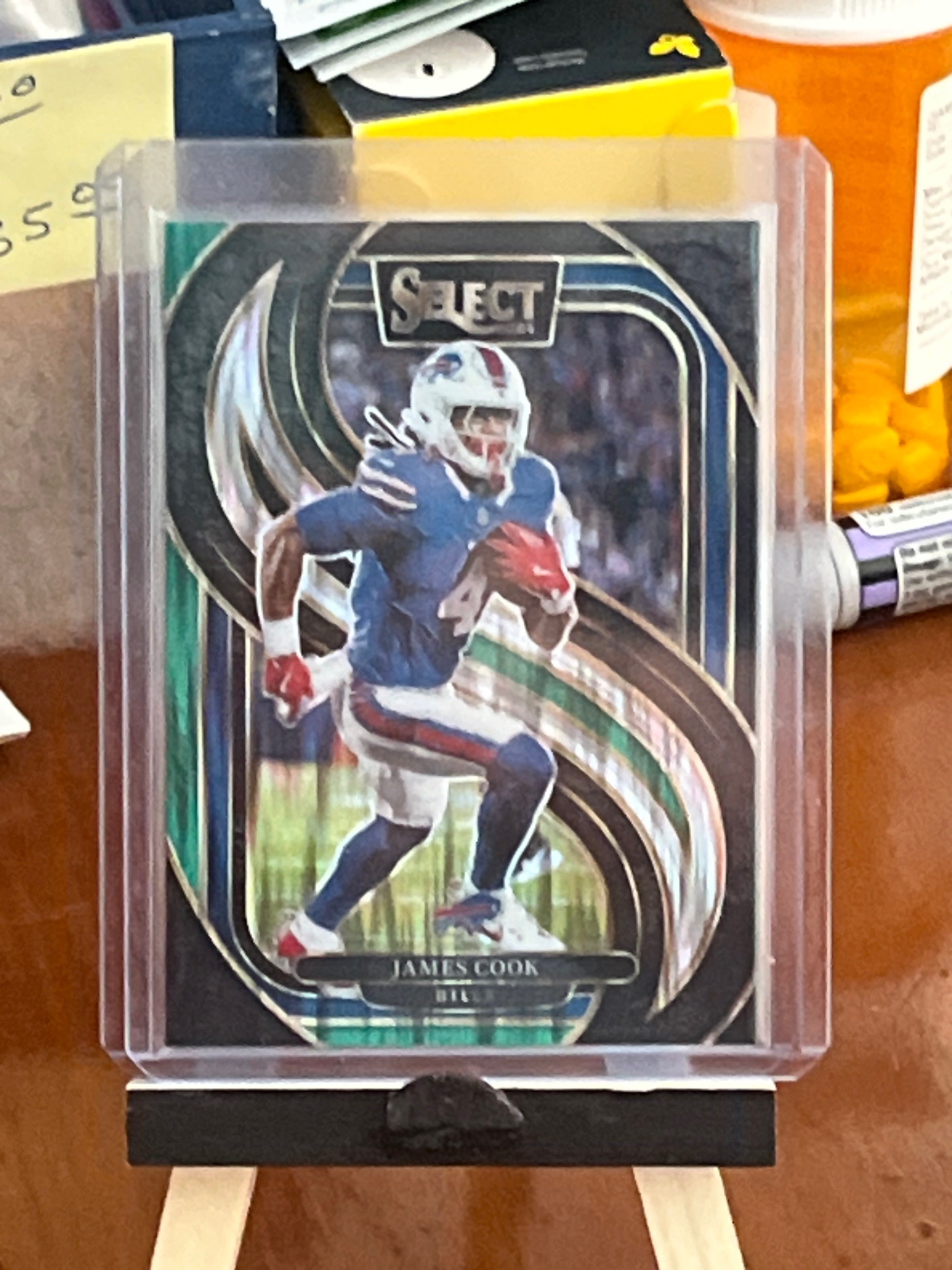 This is a 2023 Panini Select football trading card featuring Buffalo Bills running back James Cook. The card showcases the distinctive 'X-Factor' or 'Concourse' level design common to the Select brand, characterized by intricate, sweeping die-cut aesthetic lines and a high-gloss chrome finish. This specific parallel appears to be a 'Tie-Dye' Prizm, noted by the vibrant, multi-colored kaleidoscopic swirls of green, blue, and gold that react to light. The card features a high-action photography shot of Cook in his home Buffalo Bills blue uniform, clutching the football while running. The Panini 'Select' logo is prominently displayed at the top center, and the player’s name and team are located in a sleek nameplate at the bottom. The card is housed in a clear protective top-loader. To the naked eye, the centering appears relatively well-balanced from left to right. The edges and corners, as viewed through the case, appear sharp without obvious whitening or chipping. There are no visible surface scratches or dimples on the chrome foil, though a definitive assessment would require removal from the sleeve. This modern sports card represents a premium collectible from Panini's NFL lineup, highly sought after by team collectors and investors for its refractive qualities and low-print-run potential typical of the Tie-Dye parallel series.