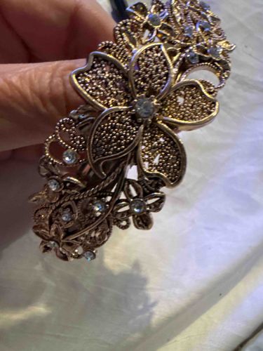 This item is an ornate, vintage-style hair barrette featuring a complex floral and foliate design. The central motif is a large six-petaled flower with a textured, granulated surface on the petals, anchored by a round-cut clear rhinestone at its center. The central flower is flanked by smaller five-petalled floral accents and scrolling vine-like filigree work. Each smaller flower also contains a clear rhinestone center, with additional stones scattered throughout the openwork metal design for added brilliance. The piece is constructed from a gold-tone or antique-finish base metal, likely a cast zinc alloy, showcasing a darkened patina in the recessed areas to enhance the depth of the filigree pattern. The construction suggests a contemporary mass-produced item designed to emulate Victorian or Edwardian aesthetic styles rather than a true antique jewel. It appears to be roughly 3 to 4 inches in length. In terms of condition, the metal shows slight surface wear consistent with use, though the plating remains mostly intact. All visible rhinestones appear to be present and secured. The craftsmanship reflects decorative costume jewelry standards, focusing on visual impact through ornate casting rather than high-end benchwork.