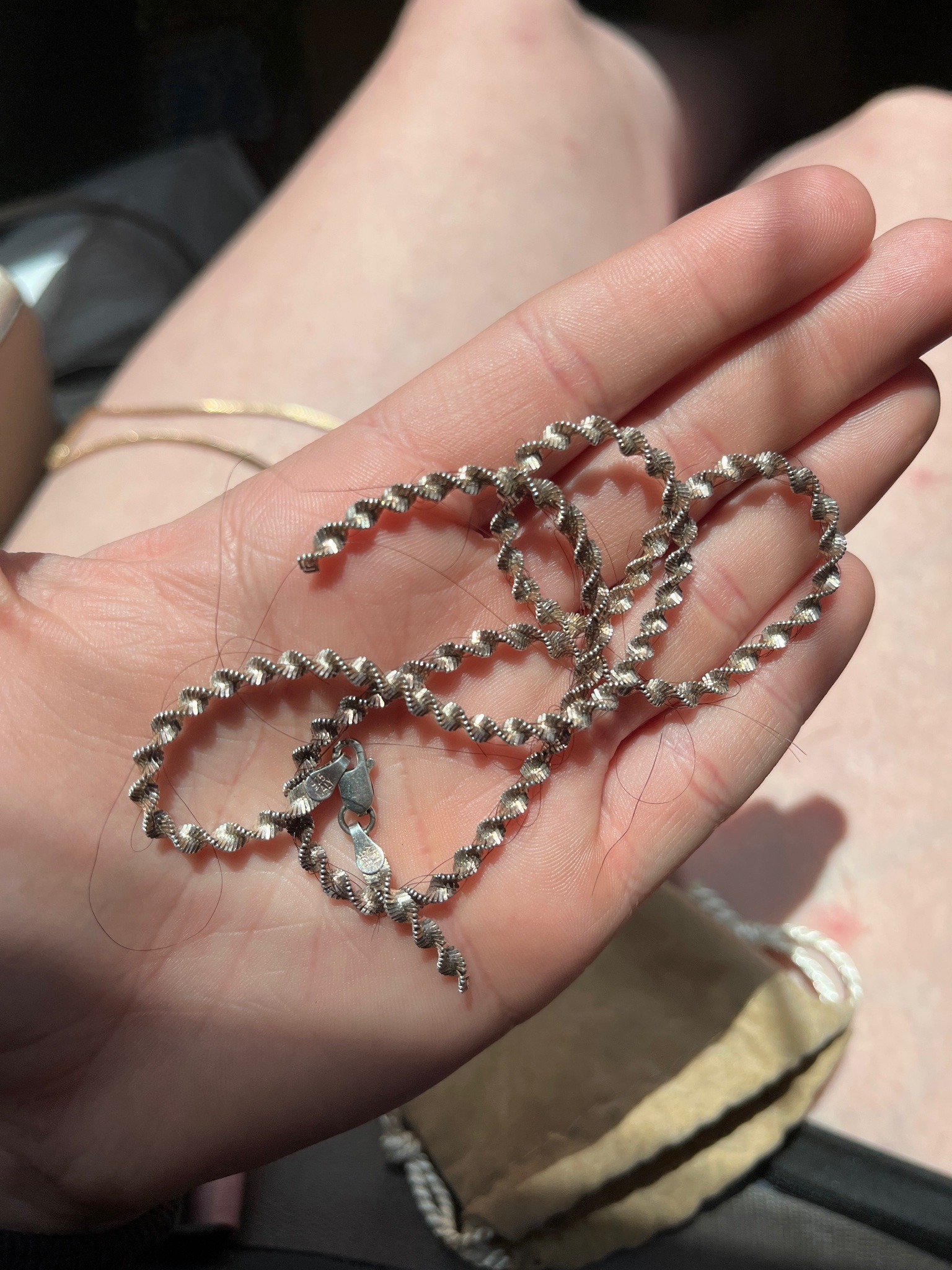 This item is a contemporary sterling silver necklace featuring a distinctive twisted helix or 'screw' link construction. The chain is approximately 2mm to 3mm in width, exhibiting a high-polish finish that creates a rhythmic, sparkling light reflection across its coiled surface. Based on the provided markings of '925' and 'ITALY,' the piece is composed of 92.5% pure silver, a hallmark of quality Italian jewelry manufacturing known for precision machine-work and high-grade finishing. The necklace is secured with a standard lobster claw clasp, which is attached via hallmarked end caps/tags. The construction shows a tight, consistent spiral pattern throughout the length of the strand. In terms of condition, the silver appears bright with minimal surface oxidation or tarnish, though there is visible debris in the form of human hair intertwined with the links, which is common for this high-friction 'twist' style of chain. The clasp mechanism appears functional. The style is typical of late 20th-century to early 21st-century Italian fashion jewelry, designed for both durability and aesthetic brilliance. The craftsmanship is indicated by the uniformity of the machine-twisted links and the integration of professional-grade findings.