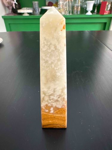 This item is a decorative obelisk carved from natural banded onyx, a variety of chalcedony. The piece features a four-sided tapered body culminating in a pyramid-shaped capstone, or pyramidion. In terms of color, the stone displays a sophisticated gradient: the lower third exhibits horizontal striations of deep amber and terracotta orange, while the upper two-thirds transition into a translucent creamy white with cloud-like inclusions and mossy, pale yellow mottling. The surface has been ground and polished to a high-gloss finish, highlighting the natural crystalline structure and internal depth of the semi-precious stone. Physically, the piece appears to be a modern lapidary creation, likely dating from the late 20th century to the present. The craftsmanship is high, with sharp, well-defined edges and a flat, stable base. Notable features include the unique organic banding near the bottom which provides a visual 'anchor' to the piece. Condition appears excellent with no visible chips, fractures, or major surface scuffing, though natural internal fissures (characteristic of onyx) are present. No maker's marks or signatures are visible in the provided view, which is common for such artisanal mineral decor.