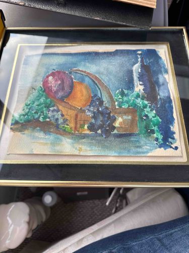 This is an original watercolor painting on textured rag paper, depicting a classic still life composition. The central subject features a wooden basket or bowl overflowing with several types of fruit, including what appears to be a large plum or pomegranate, an orange, and clusters of dark grapes. To the side, a tall, slender dark bottle stands against a deep blue, atmospheric wash background. The color palette is vibrant, utilizing rich purples, burnt oranges, and deep indigoes contrasted with leafy green accents representing foliage. The application is fluid and expressive, consistent with mid-to-late 20th-century modernist watercolors, showing a confident use of wet-on-wet techniques mixed with defined brushwork. The paper edges are slightly uneven, suggesting a hand-cut sheet. It is housed in a contemporary double-matted frame; the inner mat is a gold-toned metallic leaf or paint, while the outer mat appears to be a black textured board, all enclosed within a thin gold-colored metal frame. The condition of the artwork itself appears stable with no visible foxing, though the paper shows slight undulation characteristic of water-based media. No signature is immediately visible on the front of the work, but it may be obscured by the matting or present on the verso. The overall style is reminiscent of Post-Impressionist studies, emphasizing color relationships and geometric forms over tight realism.