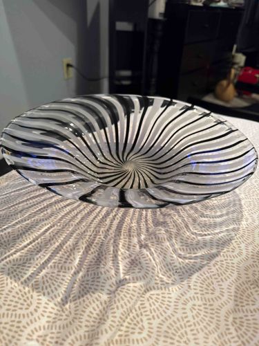 This is a large, shallow, circular art glass centerpiece bowl featuring a striking op-art influenced spiral design. The bowl is constructed from high-quality clear glass with integrated, alternating ribbons of opaque white and deep black glass that emanate from a central vertex. These bands create a dynamic, swirling kinetic effect that draws the eye toward the center. The rim appears smoothly polished and slightly rounded, suggesting a blown or centrifugal casting glass-making technique. The piece exhibits a wide, low profile with a flat base, though any specific pontil marks are obscured by the perspective. Its style is indicative of late 20th-century contemporary glasswork, possibly Murano (Venice) or a high-end Scandinavian studio factory. The glass appears to be in excellent condition with no visible chips, cracks, or heavy surface scratching. The craftsmanship is evident in the precise spacing of the spiraling filigree bands, which remain uniform throughout the diameter of the vessel.