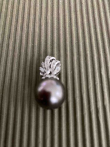 This elegant piece of fine jewelry features a large, spherical Tahitian cultured black pearl, likely measuring between 10mm to 12mm in diameter. The pearl exhibits a high-luster surface with the characteristic 'peacock' overtones, displaying deep charcoal, silver, and subtle purple hues. Atop the pearl is an ornate white metal bail, likely crafted from 14k or 18k white gold or platinum, designed in a decorative flourish or stylized leaf pattern. This bail is pave-set with numerous small, round-brilliant cut diamonds that add significant brilliance to the piece. The construction appears to be high-quality, with the pearl securely pinned to the setting. Condition-wise, the pearl shows a smooth nacre with no visible pits or surface abrasions in the photograph, suggesting a high grade. The metalwork shows no signs of significant wear or tarnish. While no maker's marks are visible from this angle, the complexity of the bail indicates contemporary professional craftsmanship. The style reflects modern formal elegance, suitable for evening wear or high-end collections.