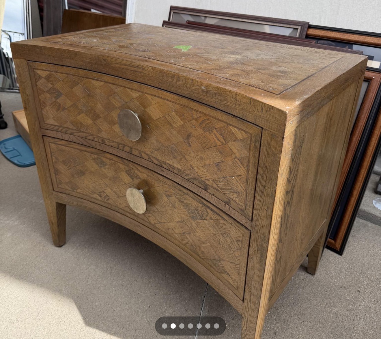 This is a rectangular mid-century modern commode or nightstand featuring a distinctive diamond-pattern parquet (marquetry) veneer on both the top surface and the dual drawer fronts. The piece is constructed from oak with a light-to-medium honey finish that highlights the natural grain. It features two large, stacked drawers, each centered with a substantial, oversized circular metal pull handle that appears to have a brushed nickel or satin brass finish. The cabinet is supported by four square, tapered legs that flare slightly outward, a hallmark of mid-20th-century design. The craftsmanship is evident in the precision-cut parquetry and the thin wood inlay borders framing the drawer fronts. Condition-wise, the piece shows visible signs of age and wear; there is noticeable scuffing and finish loss along the sharp upper right edge and corners. A small green adhesive residue or sticker is visible on the top surface. No manufacturer's stamp is immediately visible from this angle, but the style is consistent with high-end furniture manufacturers from the 1960s or 1970s. The overall structure appears sound, though the patina suggests it has been well-used over several decades.