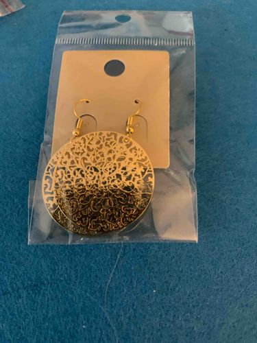 A pair of contemporary fashion earrings featuring large, circular drop pendants with a highly decorative filigree or laser-cut openwork design. The items are fashioned from a gold-toned base metal, likely brass or aluminum with a thin metallic plating to achieve a high-shine yellow gold appearance. Each earring is suspended from a simple french-style ear wire with a small bead and coil detail at the base of the hook. The circular disks measure approximately 35-40mm in diameter and showcase an intricate, organic scrolling pattern that mimics traditional Moroccan or floral lacework. The metal appears very thin and lightweight, consistent with modern mass-produced costume jewelry. The items are presented in a mint, unused condition, still attached to a plain kraft paper display card and sealed within a clear polypropylene adhesive-flap bag. There are no visible maker's marks, metal purity stamps, or branding on the packaging, indicating they are likely contemporary imports from the 21st century. The finish is bright and reflective with no evidence of oxidation, tarnishing, or plating loss. Overall craftsmanship is standard for commercial fashion accessories, relying on machine-precision cutting rather than hand-forged techniques.