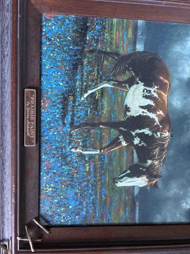 This artwork, titled 'Prairie Paint,' is a framed print or textured canvas reproduction by the American Western artist Danny McAnally. The piece depicts a bay pinto or 'paint' horse grazing in a vibrant landscape filled with blue, red, and yellow wildflowers, likely representing bluebonnets and Indian paintbrushes under a moody, overcast sky. The painting style features heavy impasto-like textures and impressionistic brushstrokes in the background, contrasting with the more detailed rendering of the horse's anatomy and coat. The artwork is housed in a unique rustic wooden frame that features mitered corners secured with decorative leather or rawhide cross-stitching, common in the Western Americana style of the late 20th century. A textured wooden nameplate is attached to the left inner molding, identifying the title and artist. The frame shows minor signs of age-related wear, including soft scuffs on the dark stain and dust accumulation in the grain. The print itself appears well-preserved with no visible fading, tears, or staining. The craftsmanship reflects a mass-produced but high-quality decorative art market designed for Western-themed home decor, likely dating from the 1980s or 1990s.