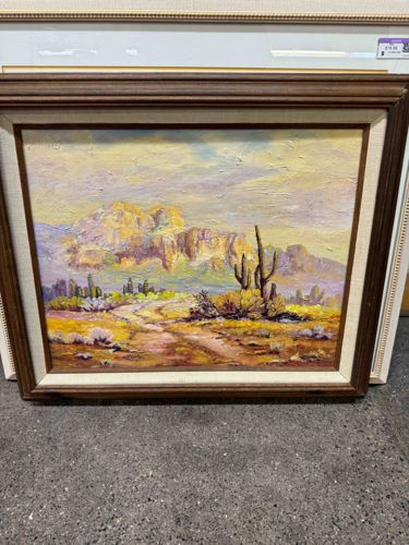 This original oil on canvas artwork depicts a sweeping Southwestern desert vista, possibly representing the Superstition Mountains or a similar Arizona landscape. The painting is executed in an impressionistic style with heavy, impasto brushwork that creates a rich, tactile surface texture. The color palette is dominated by warm ochres, golden yellows, and earthy browns in the foreground, transitioning into soft purples, lavenders, and pale blues in the atmospheric mountains and sky. A prominent Saguaro cactus serves as a focal point in the middle ground, standing alongside desert scrub and a winding dirt path that leads the viewer's eye into the composition. The artwork is housed in a period-appropriate multi-layered frame consisting of a dark stained wood outer molding, a neutral linen-covered liner, and a thin gold-toned inner fillet. The style and framing suggest a mid-to-late 20th-century origin, likely circa 1960s-1980s. The condition appears stable with no immediate signs of flaking or significant craquelure, although the linen liner shows minor age-related discoloration. The craftsmanship reflects a confident hand with a strong grasp of light and atmospheric perspective typical of regional American plein air or studio artists of the period.