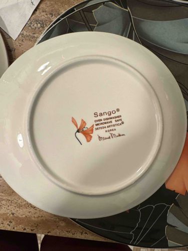 This is a white ceramic dinner plate, specifically part of the 'Artistica' collection by Sango (Pattern number 367034). The plate is circular with a shallow well and a raised foot ring on the underside. The body is a sturdy, glazed stoneware or refined ceramic that is ivory or off-white in color. The center of the underside features a clear manufacturer's hallmark in a brown-toned ink, which includes the Sango brand name, the collection title 'ARTISTICA', the specific pattern number, and an orange floral graphic accompaniment. Additionally, it contains utilitarian information indicating the piece is 'OVEN DISHWASHER MICROWAVE SAFE' and was made in Korea. A signature, likely for the artist Michael Malthner who collaborated with Sango, is also visible. The condition appears to be very good with no visible chips, cracks, or heavy crazing, though minor shelf wear on the unglazed foot ring is expected for a vintage item. This pattern typically dates to the 1980s or 1990s, characterized by its clean, contemporary aesthetic and high-quality durable glaze.