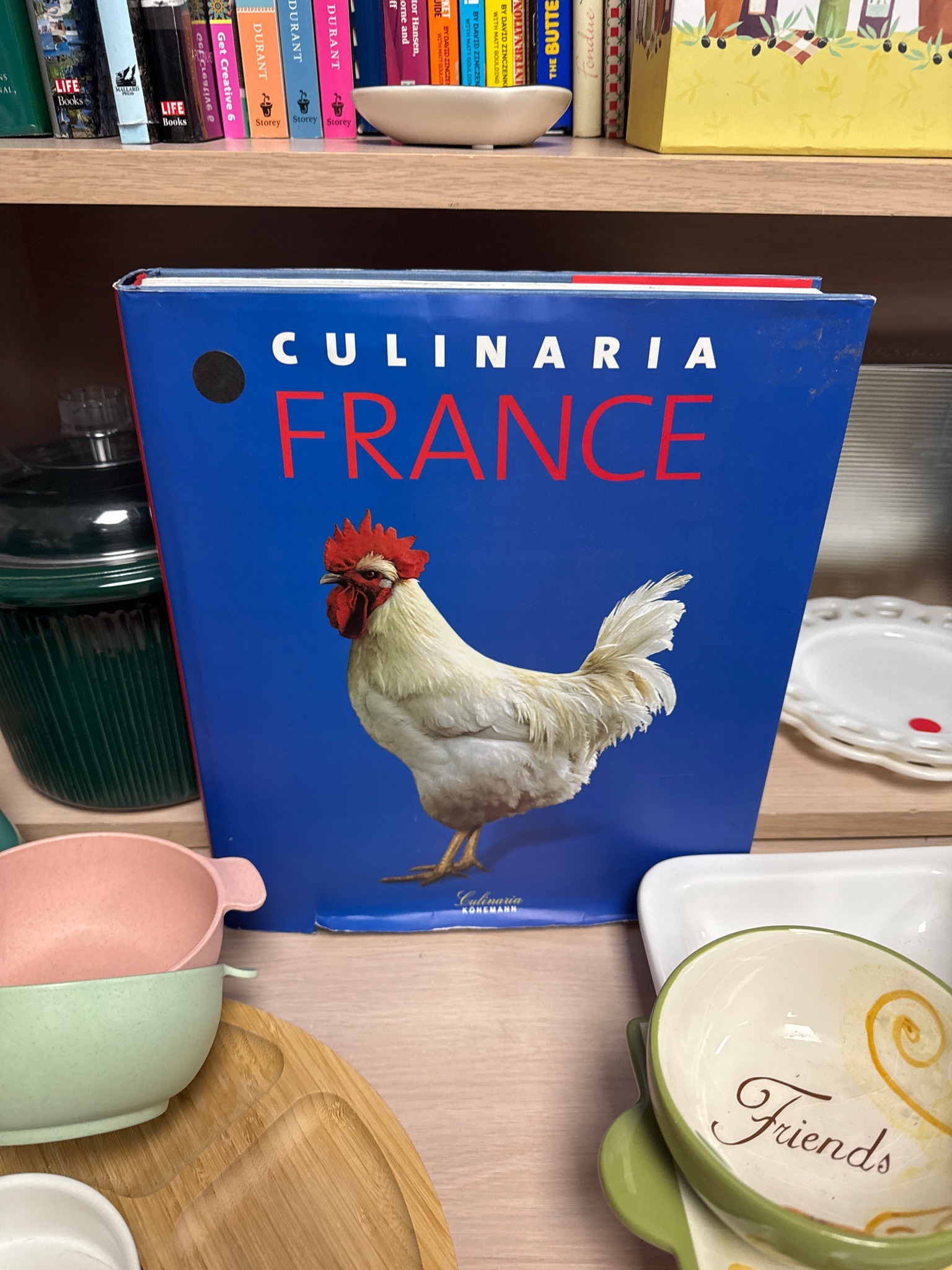 This is a large-format hardcover culinary reference book titled 'Culinaria France,' published by Könemann. The book features a vibrant blue dust jacket with the title in bold white and red sans-serif typography. The primary cover illustration is a detailed photographic image of a white rooster with a bright red comb. Physically, the book appears to be a substantial coffee-table-sized volume with a thick spine, suggesting a high page count typical of the Culinaria series, which focuses on regional gastronomy and cultural history. The condition of the dust jacket shows visible wear, including a small circular black sticker in the upper left corner, minor edge wear, and a small tear at the bottom center edge. There are also slight scuff marks and faint staining visible on the blue surface, particularly on the right side. The binding appears intact with red and white headbands visible at the top. The 'Culinaria' and 'KÖNEMANN' publisher logos are prominently displayed at the bottom of the front cover. This title is part of a highly respected series released in the late 1990s and early 2000s, known for high-quality photography, regional maps, and deep ethnographic explorations of food culture. The craftsmanship involves heavy gloss paper and high-resolution color printing, appealing to both culinary professionals and hobbyists.