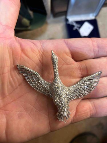 This exquisite piece is a high-jewelry brooch crafted by Harry Winston, featuring a swan in flight. The item is constructed from premium platinum, a hallmark material for the maison, chosen for its strength and neutral color that enhances diamond brilliance. The swan's body and neck are densely pavé-set with numerous round brilliant-cut diamonds, creating a shimmering, textured surface that mimics the softness of feathers. The outstretched wings and tail feathers are meticulously set with graduated baguette-cut diamonds, arranged in a channeled radiating pattern to convey movement and structure. Each stone is handset with precision, characteristic of 20th-century high-jewelry craftsmanship. Based on the style and setting techniques, this piece likely dates to the mid-to-late 20th century. While maker's marks are not visible in the primary image, they would typically be located on the reverse side near the pin mechanism. The condition appears excellent with all stones intact and the platinum showing minimal surface wear, retaining a bright, high-polish finish. The design exemplifies the 'King of Diamonds' aesthetic, prioritizing stone quality and intricate geometry.