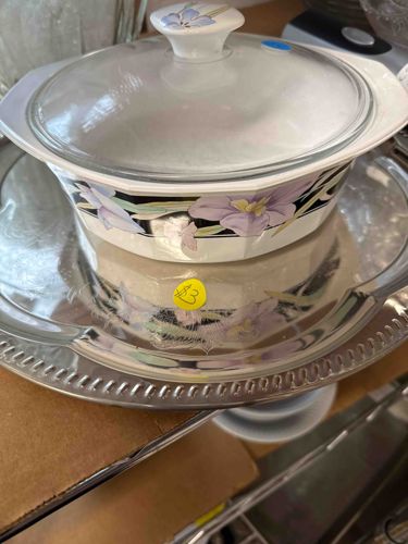 This is a vintage multi-piece serving set consisting of a white ceramic or Pyroceram casserole dish, a clear glass lid, and a reflective silver-tone metal tray. The casserole dish features a distinct 'Iris' or floral pattern characterized by lavender and soft pink flowers with green leaves against a black geometric band. This specific aesthetic is highly reminiscent of the 1980s or early 1990s designs produced by CorningWare or Corelle. The dish has a hexagonal or faceted exterior shape and integrated side handles. The clear glass lid is fitted with a white ceramic finial (handle) that repeats the iris floral motif on its top surface. Below the dish is a circular, highly polished silver-plated or stainless steel tray featuring a scalloped edge with a gadroon (rope-like) embossed border. The condition appears to be typical for pre-owned vintage kitchenware; there is a visible yellow price sticker on the metal tray, and while the ceramic and glass appear intact without major chips, the metal surface shows minor scratches and reflections common with light use. The craftsmanship reflects mass-produced but durable high-quality household goods from the late 20th century.