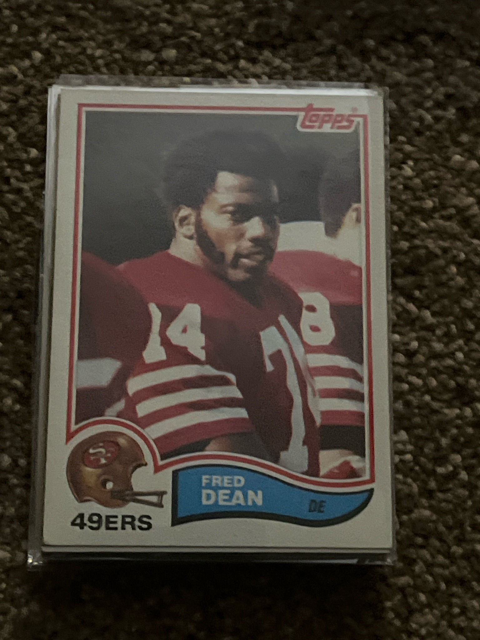 This is a vintage 1983 Topps football trading card featuring Hall of Fame defensive end Fred Dean of the San Francisco 49ers. The card is standard size (2.5" x 3.5") printed on semi-glossy cardstock. The design features a double-border aesthetic: a thin red outer line and a thicker blue ribbon at the bottom containing the player's name and position (DE). A circular graphic on the bottom left displays the 49ers helmet logo above the team name. The central image is a colorful candid photograph of Dean on the sidelines in his red home jersey. The iconic 'Topps' logo is situated in the upper right corner. Regarding condition, the card is housed in a clear protective sleeve. The centering appears slightly heavy toward the left and bottom. The corners show minor signs of softening, typical for raw cards of this era, though no major creases, stains, or surface scratches are immediately evident from the photograph. This card represents a significant era in NFL history, featuring a legendary pass rusher who was a key component of the 49ers' dynasty in the early 1980s.
