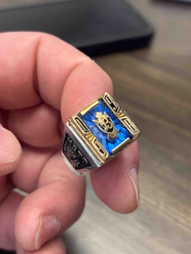 This is a contemporary commemorative class ring featuring a two-tone metallic design, likely constructed from a jeweler's alloy such as Lustrium or a similar non-precious white metal with gold-tone accents. The center of the ring features a rectangular, radiant-cut synthetic blue spinel or sapphire stone, which has a multi-faceted 'sunburst' pattern on the reverse side to enhance light reflection. Affixed to the top of the stone is a gold-toned crest or 'encrusting' depicting a stylized letter 'B' within a shield topped with a crown. The bezel is yellow-gold in color with black antiquing in the recessed geometric Art Deco-style patterns, while the main shank is silver-toned. On the left side of the shank, the name 'MATT' is visible in raised block lettering above a set of crossed objects, possibly representing a specific extracurricular activity or sport. The ring shows signs of moderate wear, including surface scratches on the metal and slight blunting of the sharp details on the crest. The overall craftsmanship suggests a mass-customized production method typical of companies like Jostens, Balfour, or Herff Jones from the late 20th to early 21st century.
