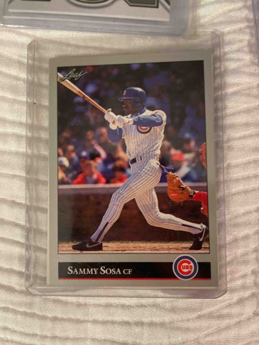 This is a 1992 Leaf series baseball card featuring Sammy Sosa during his tenure with the Chicago Cubs. The card shows Sosa in a dynamic action pose, following through on a swing while wearing the classic Cubs home pinstripe uniform. Physically, the card features the signature 1992 Leaf design with a thick grey/silver border and high-quality glossy cardstock. It is housed in a clear protective plastic top-loader, which has preserved its condition. Notable markings include the 'Leaf' script logo in the top left corner, the player name 'Sammy Sosa CF' at the bottom, and the circular Chicago Cubs 'UBS' logo in the lower right. The photography is sharp, showing Sosa's focus and the blurred crowd in the background. In terms of condition, the centering appears slightly biased towards the right border, but the corners visible through the sleeve appear relatively sharp without significant whitening or fraying. There are no obvious creases, surface scratches, or staining visible on the front face. This card hails from the early 1990s 'junk wax' era but remains a popular collectible for fans of the home run era. The print quality is high, reflecting the premium positioning of the Leaf brand during that manufacturing period.