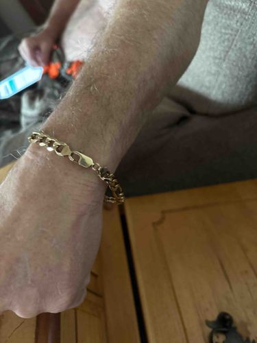 This item is a yellow gold curb link (Grumetta) chain bracelet, featuring a series of uniform, interlocking flat-faced circular or slightly oval links that lay flush against the skin. The metal exhibits a rich, warm tone characteristic of 10k or 14k yellow gold compositions. In terms of construction, the piece is secured with a classic lobster claw clasp, which is connected to the main chain via teardrop-shaped end caps. Based on its scale relative to the wearer's wrist, the bracelet appears to have a width of approximately 6mm to 8mm, classifying it as a medium-weight men's style. The surface of the links shows high-polish finishing with mild surface abrasions and micro-scratching consistent with regular wear. No large dents, twisted links, or deep pitting are visible, suggesting the piece has been well-maintained. While specific hallmarking is not legible from the distance of the photo, the clasp design is typical of late 20th-century to contemporary commercial jewelry manufacturing. The links appear to be solid rather than hollow, indicated by the way they drape and hold their shape under tension. This style is a timeless staple of unisex jewelry, valued for its durability and classic aesthetic.