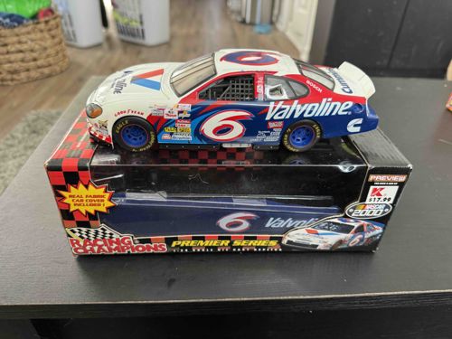This item is a 1:24 scale die-cast replica of Mark Martin’s #6 Valvoline Ford Taurus, manufactured by Racing Champions as part of their 'Premier Series.' The car features a white, red, and blue paint scheme with high-quality decal graphics representing various sponsors, including Valvoline on the hood and side panels, Cummins on the rear quarter panels, and Goodyear Eagle tires. The car is constructed of heavy-gauge die-cast metal, featuring a detailed plastic interior with a visible roll cage and black window netting. Notable features include a 'NASCAR 2000' logo on the packaging and a 'Preview' label, indicating this model was released to coincide with the start of the 2000 racing season. The car sits atop its original retail box, which is marked with a vintage Kmart price tag of $17.99. The packaging further states it includes a 'real fabric car cover,' a unique value-add for this specific series. The die-cast appears to be in excellent, near-mint condition with no visible paint chips or decal peeling. The box shows some minor shelf wear and a slight corner ding but remains structural and relatively crisp. This piece represents the peak of the NASCAR die-cast collecting boom of the late 1990s and early 2000s.