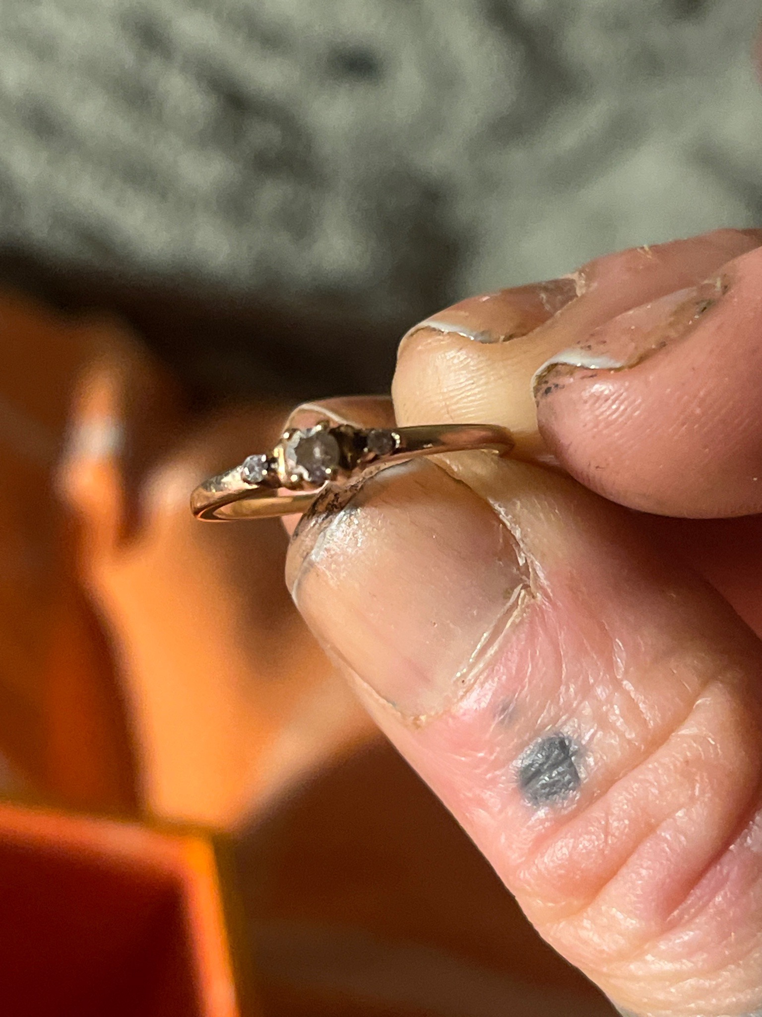 This is a three-stone 'past, present, future' style ring, likely crafted from 10k or 14k yellow gold. The centerpiece is a small round-cut diamond, estimated to be approximately 0.10 to 0.15 carats, flanked by two smaller accent diamonds. The stones are set in what appear to be illusion or miracle settings to enhance their perceived size, held by traditional four-prong arrangements. The shank is a slim, polished band that tapers slightly toward the head of the ring. Notable features include the classic trilogy design, representing a timeless mid-to-late 20th-century style, possibly from the 1980s or 1990s. Regarding condition, there is visible heavy oxidation, tarnish, and accumulated debris around the prongs and the underside of the stones, which dulls the brilliance of the diamonds. The metal shows significant surface scratches and a dulling of its original luster, suggesting frequent wear. No clear maker's marks are visible in the photograph, but the construction suggests mass-market commercial production rather than a bespoke artisan piece. The overall quality appears consistent with standard fine jewelry available at major retailers during the late 20th century.