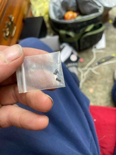 A set of two cylindrical replacement lighter flints contained within a small, transparent plastic resealable poly bag. Each flint is approximately 5mm in length and 2mm in diameter, manifesting a dark gunmetal gray or graphite-like color with a matte, slightly textured surface finish designed for friction. The flints appear to be composed of ferrocerium, a synthetic pyrophoric alloy. These components are standard for ignition in traditional flint-and-wheel lighters such as Zippo or Clipper models. The plastic baggie shows slight clouding and creasing from handling, while the flints themselves appear unused and in modern, functional condition without signs of moisture-related oxidation or crumbling. There are no visible maker's marks or branding on the flints themselves, which is typical for such consumable utilitarian hardware. The overall craftsmanship is precise and consistent with mass-produced mechanical accessories manufactured in the late 20th to early 21st century.