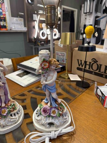 This is a vintage table lamp featuring a hand-painted porcelain base in the Meissen or Dresden style. The central figure is a cherub or putto standing alongside a cornucopia Overflowing with applied floral blooms. The figure is draped in a periwinkle blue cloth and possesses delicate facial features with blonde hair. The base is an ornate, pierced rococo-style pedestal decorated with additional polychrome applied roses and flowers in shades of purple and pink, accented with gold-painted flourishes. Physically, the porcelain shows a high-gloss glaze common in European decorative arts. The electrical components consist of a modern white cord and a brass-toned socket with a standard harp mounting, suggesting a mid-to-late 20th-century rewire or manufacture. A second matching lamp is partially visible, indicating these may be a pair. The condition appears fair to good; however, typical of these delicate pieces, there are visible chips and losses to the fragile flower petals on both the base and the cornucopia. The gold gilding shows light rubbing wear on the raised relief parts of the base. No maker's mark is immediately visible on the exterior, though such marks are often located on the underside of the porcelain. The craftsmanship is characterized by ornate, labor-intensive hand-modeling of the floral elements and classical anatomical proportions in the ceramic figure.