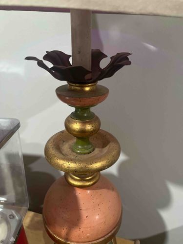 This is a decorative table lamp featuring a stacked baluster-style body with a unique multi-colored finish. The construction appears to be a combination of turned wood or composite material, finished with a variety of textures including gold leaf or metallic paint, sage green matte paint, and a speckled terracotta or salmon-colored glaze. The design is characterized by its geometric variety, utilizing spheres, discs, and rings of varying proportions. A notable feature is the ornate, dark metal foliate bobeche or petal-like collar situated directly below the lamp socket, which provides an organic contrast to the structured stem. The lamp is topped with a simple white or cream fabric drum shade, supported by a central harp and riser. The overall style is a modern, eclectic interpretation of traditional Neoclassical or Hollywood Regency aesthetics, likely dating from the late 20th century to the early 21st century. Regarding condition, there is visible dust accumulation in the crevices, particularly on the gold-toned discs, and some minor surface abrasions or wear to the painted finishes consistent with age and use. The speckled salmon-colored sections appear intentionally distressed to create a faux-stone or ceramic appearance. No maker’s marks are visible in the provided image, but the assembly suggests boutique or high-end retail manufacturing craftsmanship.