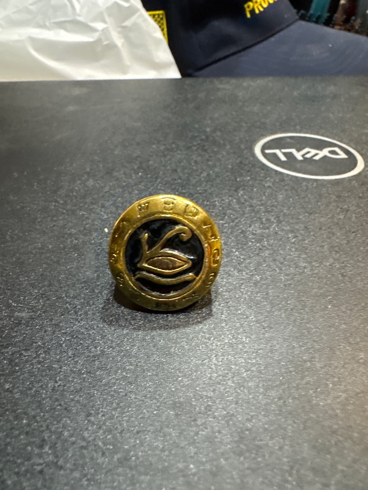 This item is a circular commemorative button or lapel pin associated with the official fan club 'Le-Ciel' for the Japanese rock band L'Arc-en-Ciel. The piece is constructed from a gold-toned metal alloy with a distinctive two-piece aesthetic design. The central motif features the stylized 'Le-Ciel' logo—an abstract eye-like shape that incorporates an 'L' and a 'C'—rendered in relief against a recessed, black enamel or painted background. This central emblem is encircled by a raised golden bezel that is engraved with circular text, which appears to include characters and symbols associated with the band's identity. The item shows signs of significant age and use; the gold plating exhibits notable surface wear, minor pitting, and oxidation, particularly along the outer rim and the raised edges of the logo. A natural patina has developed in the deeper crevices of the lettering and central design. Given the typography and logo style, this likely dates back to the late 1990s or early 2000s, during the band's peak popularity era. The craftsmanship is consistent with high-quality promotional merchandise of the period, utilizing a die-struck method for the metal components. Its historical value is tied specifically to the J-Rock collector market and fan club memorabilia history.