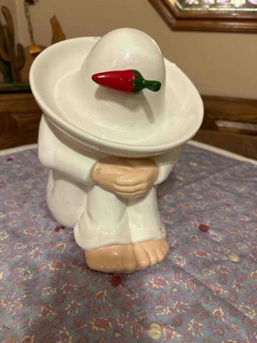 Ceramic chip/cookie jar with red pepper on hat which is the lid