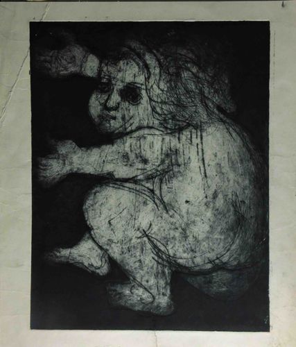 This artwork is a monochrome print, likely an etching or aquatint, executed on paper measuring approximately 26.37 x 30.87 units. The composition features a stylized, crouching figure with childlike proportions, rendered in a raw, expressive manner. The figure is depicted with large, emotive eyes and reaching hands, set against a dark, heavily inked background that provides high contrast. The technique utilizes frantic, scribbled linework and tonal scratching to suggest texture and volume, a style reminiscent of Art Brut or mid-20th-century Expressionism. This approach imparts a somber, perhaps haunting quality to the subject. Notable physical characteristics include heavy ink saturation in the negative space and a delicate cross-hatching effect within the figure's form. Regarding condition, there are visible signs of wear on the surrounding paper support, including significant creasing on the left side and upper edge, alongside general yellowing or foxing consistent with age. No immediate signature or maker's mark is visible within the frame of the image, suggesting it may be a trial proof or part of an unsigned series. The craftsmanship displays a deliberate rejection of classical realism in favor of emotional immediacy and tectonic line quality.
