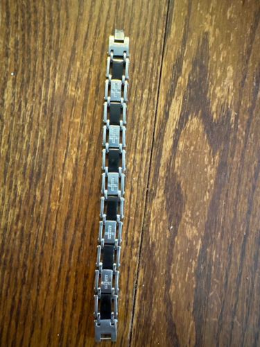 This item is a contemporary men's fashion bracelet featuring a multi-component link construction. The design utilizes a high-contrast aesthetic, combining polished or brushed silver-toned metal (likely stainless steel given its industrial luster) with black textured rubber or silicone inserts. The bracelet is composed of alternating rectangular segments. Every other link features a cross-hatched metal plaque set with a small, circular white stone, identified by the user as a diamond. These stones appear to be single-cut or melee-sized diamonds, flush-set within a square or cross-shaped motif. The bracelet measures approximately 8 to 8.5 inches in length and uses a fold-over clasp mechanism for closure. The condition appears to be pre-owned but well-maintained, with minor superficial surface scratches visible on the metal surfaces typical of moderate wear. The combination of industrial materials like steel and rubber suggests a modern style period, likely manufactured within the last 10 to 15 years. The construction is mass-produced yet durable, characterized by pinned hinges that allow for flexibility. No visible maker's marks or hallmarks are identifiable from the provided perspective, though such marks are typically found on the interior of the clasp.