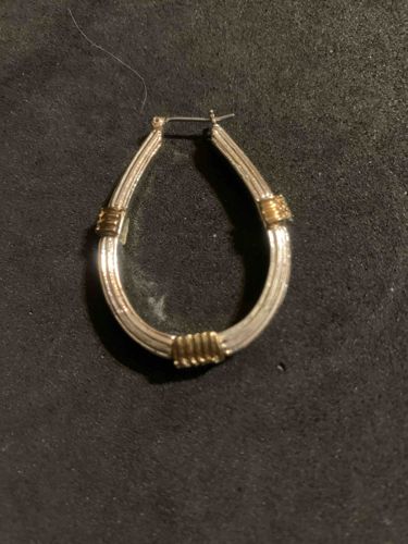 This is a single fashion hoop earring featuring a distinctive elongated teardrop or U-shaped silhouette. The main body of the earring is constructed from a silver-toned metal with a vertically ribbed or fluted texture that runs along the outer circumference. Accenting this silver base are three decorative bands of gold-toned wire-wrap detailing located at the base and on each side, creating a two-tone aesthetic. The earring utilizes a hinged saddleback closure (also known as a latch back) with a thin metal post designed for pierced ears. Based on the visual appearance, the materials are likely plated base metal or sterling silver with gold vermeil accents. The craftsmanship demonstrates a mass-market contemporary style, possibly dating from the late 20th century to the early 2000s. Condition-wise, the item shows visible signs of wear including surface tarnishing, some dulling of the metallic luster, and minor scratches consistent with previous use. The post appears slightly bent, and there is a noticeable buildup of patina in the recessed grooves of the ribbing. No specific maker's marks are visible in the provided image, but the design is characteristic of casual department store jewelry.