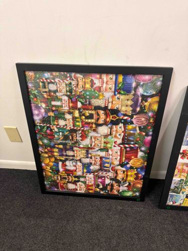 This item consists of a completed jigsaw puzzle featuring a festive holiday-themed nutcracker collage, presented in a simple black frame. The artwork is a dense, colorful composition showcasing various traditional Christmas nutcrackers in diverse uniforms (red, blue, green, and gold), interspersed with evergreen needles, candy canes, and metallic-look baubles. The puzzle appears to be a standard cardboard die-cut variety, likely 500 or 1,000 pieces based on the visible interlocking pattern. It is mounted behind glass or plexiglass within a matte black wooden or composite frame that provides a clean, modern aesthetic. The construction suggests it was an at-home project that has been preserved for decorative use. The condition appears excellent with no visible missing pieces or surface lifting, though the frame shows very minor dust accumulation typical of household display. There are no discernible maker's marks visible on the front, but the graphic style is characteristic of contemporary puzzle brands. This piece represents modern holiday folk-art decor, bringing a colorful, whimsical element to seasonal interior design.