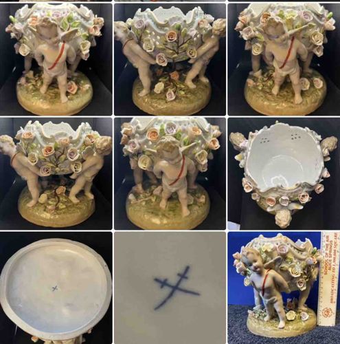 This elaborate decorative porcelain centerpiece features three neoclassical putti or cherubs supporting a reticulated bowl, heavily adorned with hand-modeled porcelain roses and foliage. The piece is constructed from hard-paste porcelain with a polychrome enamel finish. Each cherub is depicted in a dynamic pose, wearing a thin red sash, standing upon a rocky, moss-textured base decorated with scattered rosebuds. The central bowl features a scalloped, shell-like rim with delicate piercings (reticulation) and is festooned with high-relief floral encrustations in shades of pale pink, lavender, and cream. The undersurface reveals a blue underglaze 'crossed swords' mark, characteristic of the Meissen factory style, though the specific execution and slightly muddied details suggest it may be a late 19th-century or early 20th-century German Dresden-style production (often referred to as 'Sitzendorf' or similar contemporary producers). Condition analysis shows significant fragility; common with these pieces, there appear to be numerous small chips and losses to the delicate petal edges and leaf tips. There is visible surface grime in the crevices of the intricate floral work. The presence of the crossed swords mark without specific factory variations suggests a decorative piece intended to emulate the Rococo Revival style popular in the Victorian era.