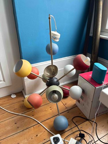 This is a mid-century modern style table lamp featuring a 'Sputnik' or atomic-age starburst design. The lamp is characterized by a central black sphere from which multiple brass-finished or gold-tone metal rods radiate outward at various angles. In place of standard light bulbs at the end of every rod, several feature hemispherical enameled metal shades in a vibrant matte palette of primary and secondary colors including yellow, orange, red, blue, green, and white. The shades have white interiors to reflect light; one shade is currently missing its bulb, while another reveals a small, incandescent-style bulb. The central stem extends vertically and appears to terminate in a hanging mechanism or top finial, with a white electrical cord protruding. The overall construction suggests a vintage 1950s or 1960s aesthetic, possibly in the style of Stilnovo or Diabolo. Condition-wise, the lamp shows signs of age and wear; there is visible tarnishing and patina on the central brass rods and base, and some of the painted shades exhibit minor scuffing or surface dirt. The wiring includes a modern UK plug adapter, suggesting it has been used recently but might requires safety testing. The craftsmanship is of a industrial-decorative hybrid style typical of post-war Italian or American lighting design.