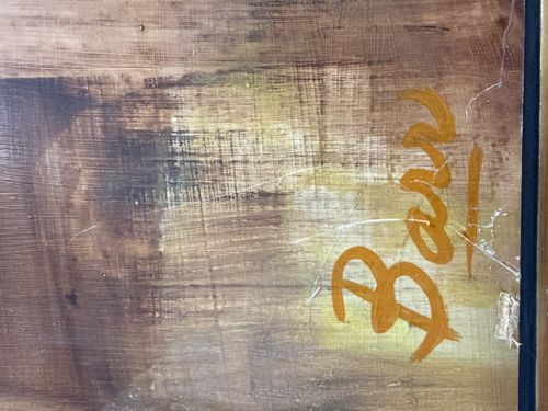 This item is an original oil painting executed on a textured canvas, likely dating from the mid-to-late 20th century. The piece features a sophisticated earthy color palette consisting of raw umber, sienna, and ochre, applied with heavy brushwork and possible palette knife techniques to create a rich, layered texture. The surface shows a prominent cross-hatched weave pattern from the underlying substrate, which has been integrated into the aesthetic of the composition. A significant distinguishing feature is the bold, fluid signature 'Barr' (or potentially 'Bari') located in the lower right quadrant, rendered in a thick apricot-gold pigment that contrasts sharply with the muted background. The application of the signature suggests a confident, professional hand. Regarding condition, the painting exhibits visible signs of age including fine surface craquelure and several white linear abrasions or scratches that have disrupted the paint film, particularly near the signature. There appears to be some minor edge wear and light surface grime consistent with residential display over several decades. The style is indicative of the mid-century abstract expressionist movement, prioritizing organic forms and tonal variation. The craftsmanship is high, showing intentionality in the contrast between thin glazes and impasto applications.