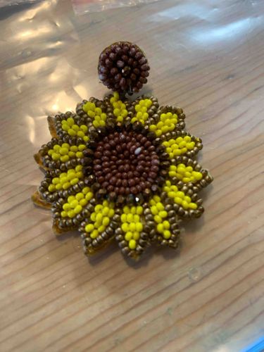 This item is a single, large-scale drop earring featuring a meticulously hand-beaded sunflower motif. The piece is constructed using an bead embroidery technique on a felt or fabric backing, which provides structural support. The design consists of a circular 'seed' center composed of dark metallic and matte brown seed beads arranged in concentric circles. Surrounding the center are pointed yellow petals created with vibrant matte yellow seed beads, framed by a border of bronzed-gold metallic beads that provide a shimmering edge. A secondary circular bead-work element at the top serves as the post attachment, repeating the dark brown color palette. The craftmanship indicates a contemporary handmade origin, likely by an artisan specializing in seed bead jewelry. The beads appear to be consistent in size (possibly 11/0 or 15/0), suggesting the use of high-quality glass beads such as Miyuki or Toho brands. Condition appears excellent with no visible thread loss, though one white stray fiber or bead is visible in the center disk. The style is indicative of modern folk art or Indigenous-inspired jewelry common in the late 20th to early 21st century.