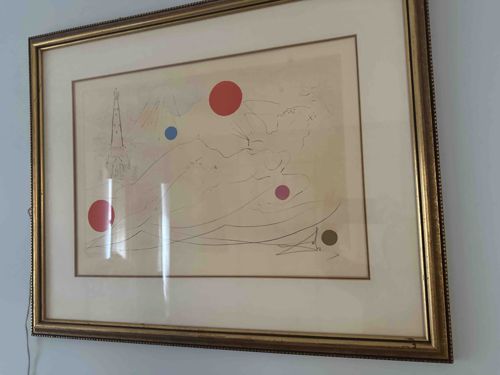 This item is a framed lithograph or etching by the renowned Surrealist artist Salvador Dalí, likely from his mid-20th-century period. The artwork features Dalí's signature dreamlike imagery, characterized by delicate, ethereal line work and bold, geometric pops of color, specifically circular motifs in red, blue, pink, and grey. The central figure appears to be a reclining nude or an abstract profile characteristic of his 'Invisible' or 'Paranoiac' series. The composition is set against an off-white or cream-toned paper ground. The artwork is housed in a large, gold-finished wooden frame with a classic beaded or decorative edge motif. It is professionally matted with a thick, neutral-toned inner mat and a thin gold fillet that complements the primary frame. Dimensionally, it appears to be a medium-to-large format print. While the glass reflects some glare, the paper appears to show slight tonal aging or light oxidation near the edges of the matting, which is consistent with age. There is a visible marking in the lower right corner that likely corresponds to Dalí's signature or an edition number, though it is slightly obscured in the photograph. The craftsmanship of the framing suggests a high-end presentation intended for a gallery or serious private collection.