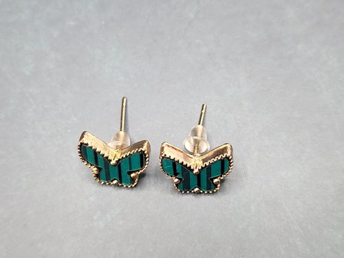 This pair of stud earrings features a stylized butterfly design, likely inspired by mid-to-late 20th-century nature motifs. Each butterfly wing is inlaid with a material that exhibits the distinct, rhythmic dark green and black banding characteristic of malachite stone or a high-quality resin composite meant to simulate it. Thin, vertical striations provide a striking contrast against the polished green surface. The inlays are set within a gold-toned metal frame, possibly yellow gold plated over brass or sterling silver. The perimeter of each butterfly is accented with a delicate beaded or 'milgrain' texture, adding artisanal detail and vintage charm. The earrings are designed for pierced ears, featuring metal posts secured with translucent plastic ear nuts (butterfly backs), which may be replacements for original metal backs. In terms of condition, there is some visible dulling and light surface scratches on the metal frames, particularly around the edges, suggesting gentle previous wear. The stones appear intact and well-seated within their mounts. These earrings represent a contemporary take on whimsical costume jewelry, likely modern (21st century) production based on the backing components and construction style. The craftsmanship shows attention to detail in the decorative borders and the alignment of the patterned inlay across the two wings.