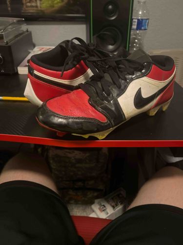 A pair of pre-owned Nike Land Shark low-top football cleats featuring a classic red, black, and white 'Chicago' colorway. The uppers are constructed from a combination of synthetic leather and durable textiles, designed for on-field performance. The aesthetic follows a paneled design with a prominent black Nike Swoosh on the lateral and medial sides. The toe box and heel counters are accented in vibrant red, while the mid-panels are white. The cleats utilize a traditional black lace-up closure system through reinforced eyelets. Regarding condition, the shoes show significant signs of authentic athletic wear: the synthetic leather on the red toe box is heavily creased and scuffed, and there is visible dirt and yellowing on the molded plastic cleat plate. The outsoles feature non-removable, integrated rubber cleats designed for multi-surface traction, which appear worn down from active use. Despite the cosmetic surface wear and folding of the material at the flex points, the structural integrity of the shoes seems intact. This model is a popular entry-level performance cleat from the mid-to-late 2010s, valued for its durability and iconic Nike branding.